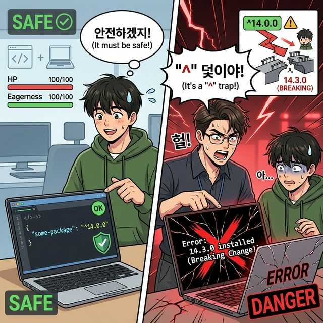 ^14.0.0์ด14.x.x์ ์ฒด๋ฅผ ํ์ฉํ๋ค๋ ๊ฑธ ๋ชฐ๋๋ ๊ฒ. ๋์งธ,package-lock.json์ด ์์๊ฑฐ๋ ๋ฌด์๋๋ ๊ฒ. ๊ทธ ๋ผ์ด๋ธ๋ฌ๋ฆฌ๊ฐ14.3.0์์ Breaking Change ๋ฅผMINOR๋ฒ์ ์ ๋ฃ์ ๊ฑฐ์์ โ SemVer ์๋ฐ์ด์ฃ . ์ด๋ฐ ๊ฒฝ์ฐ๋ฅผ ๋๋นํ๋ ๋ฐฉ๋ฒ๊น์ง ๊ฐ์ด ์์์ผ ํด์."