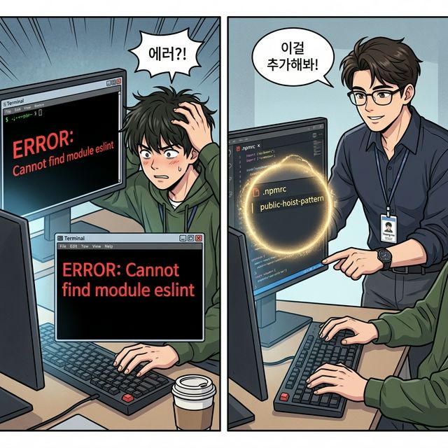.pnpmํด๋ ์์ ์ด์ด๋ดค์ด์?eslint๊ฐ ๊ฑฐ๊ธฐ ์์ ๊ฑฐ์์. pnpm ์ ๋ฃจํธnode_modules์๋package.json์ ์ง์ ์ ํ ํจํค์ง๋ง ์ฌ๋งํฌ๋ก ๋ ธ์ถํ๊ฑฐ๋ ์. ESLint ๊ฐ ์๋ค๋ ์๋ฌ๋ ์ญ์คํ๊ตฌ ESLint ํ๋ฌ๊ทธ์ธ์ด ๋ฃจํธnode_modules์์eslint๋ฅผ ์ฐพ์ผ๋ ค๊ณ ํ๋๋ฐ ๋ชป ์ฐพ๋ ์ผ์ด์ค์์..npmrc์public-hoist-pattern[]=*eslint*ํ ์ค ์ถ๊ฐํ๋ฉด ํด๊ฒฐ๋ผ์."