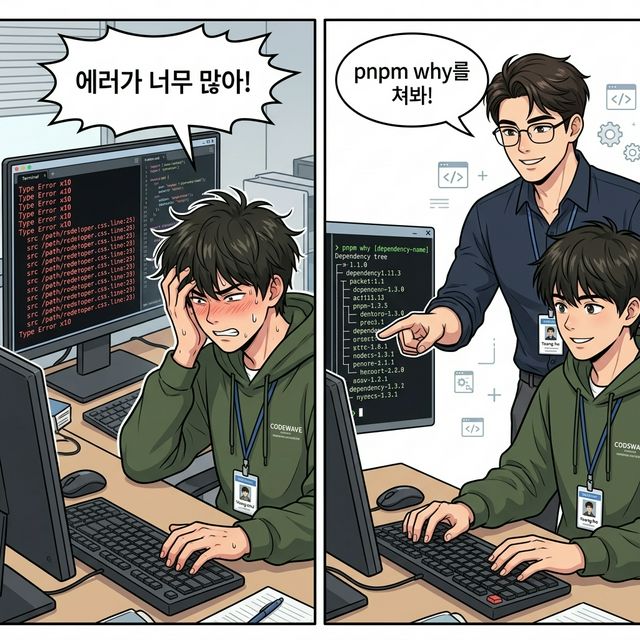 pnpm why 로 간접 의존성 출처를 추적하고, pnpm patch 로 외부 라이브러리 버그를 직접 패치하며, pnpm env 로 nvm 없이 Node.js 버전을 전환하고, pnpm-lock.yaml 을 읽어 버전 충돌의 원인을 파악하는 능력 — 이것이 pnpm 을 제대로 쓰는 시니어와 그냥 쓰는 주니어를 가른다.